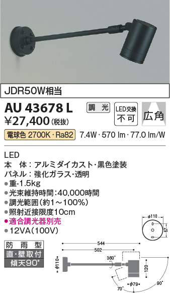 [機能/他] LED(電球色)JDR50W相当LED本体:アルミダイカスト・黒色塗装パネル:強化ガラス・透明●高-502 幅-φ79 本体長-120mm 重-1.5kg●消費電力:7.4W●定格光束:570 lm●固有エネルギー消費効率:77.0 lm/W●演色性:Ra82●色温度:2700K●光束維持時間:40,000時間●調光範囲(約1~100%)●照射近接限度10cm●適合調光器別売●12VA(100V)