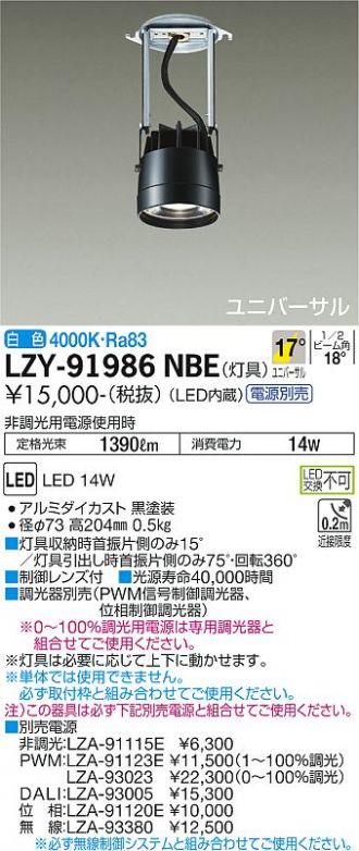 ■別売電源 非調光:LZA-91115E PWM:LZA-91123E(1~100%調光)LZA-93023(0~100%調光)DALI:LZA-93005 位相:LZA-91120E 無線:LZA-93380