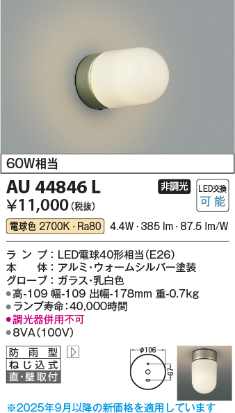 [機能/他] LED(電球色)60W相当ランプ:LED電球40形相当(E26)本体:アルミ・ウォームシルバー塗装グローブ:ガラス・乳白色●高-109 幅-109 出幅-178mm 重-0.7kg●消費電力:4.4W●定格光束:385 lm●固有エネルギー消費効率:87.5 lm/W●演色性:Ra80●色温度:2700K●ランプ寿命:40,000時間●調光器併用不可●8VA(100V)