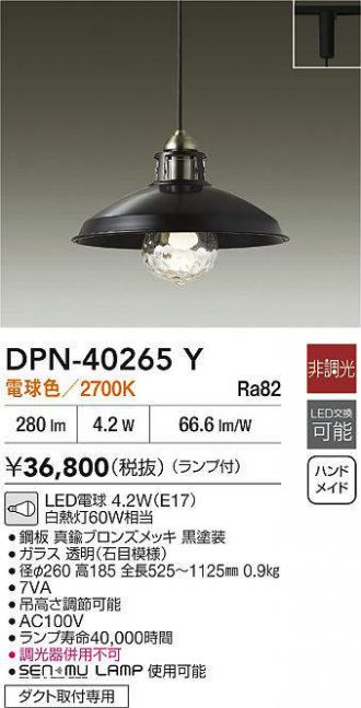 [機能/他] LED電球 4.2W(E17)電球色/2700K鋼板 真鍮ブロンズメッキ 黒塗装ガラス 透明(石目模様)径φ260 高185 全長525~1125mm0.9kg●吊高さ調節可能●AC100V●ランプ寿命40,000時間●調光器併用不可●SENMU LAMP 使用可能●7VA定格光束 280 lm消費電力 4.2 W固有エネルギー消費効率 66.6 lm/WRa82白熱灯60W相当