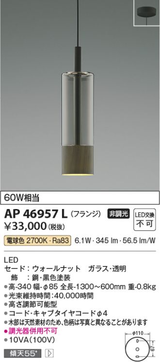 [機能/他] LED(電球色)60W相当LEDセード:ウォールナット ガラス・透明飾:鋼・マットブラック塗装●高-340 幅-φ85 全長-1300~600mm 重-0.8kg●消費電力:6.1W●定格光束:385 lm●固有エネルギー消費効率:63.1 lm/W●演色性:Ra83●色温度:2700K●光束維持時間:40,000時間●高さ調節可能型●コード・キャブタイヤコードφ4●木部は天然素材のため、色柄は写真と異なることがあります●調光器併用不可●10VA(100V)