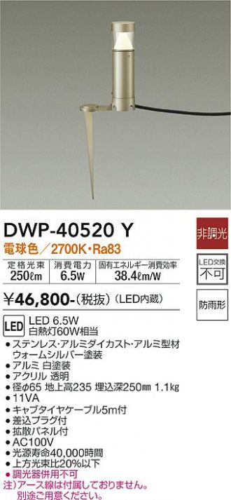 [機能/他] LED 6.5W 電球色/2700Kステンレス・アルミダイカスト・アルミ型材 ウォームシルバー塗装アルミ 白塗装アクリル 透明径φ65 地上高235 埋込深250mm1.1kg●キャブタイヤケーブル5m付●差込プラグ付●拡散パネル付●AC100V●光束維持時間40,000時間●上方光束比20%以下●調光器併用不可注)アース線は付属しておりません。別途ご用意ください。●11VA定格光束 250 lm消費電力 6.5 W固有エネルギー消費効率 38.4 lm/WRa83白熱灯60W相当