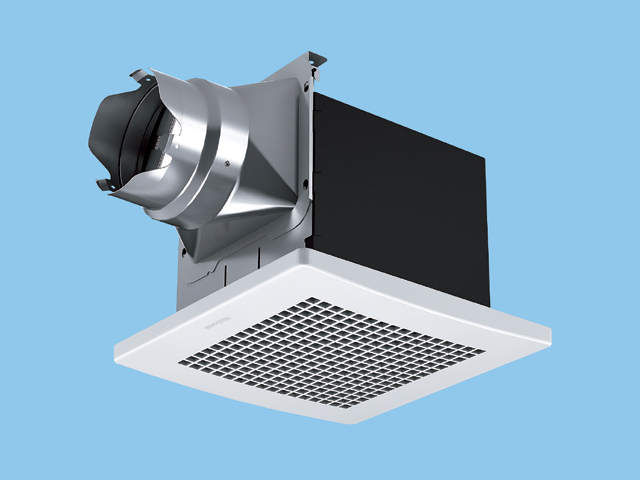 鋼板製の低騒音形本体とシンプルな樹脂製角格子ルーバーとの組合せでインテリアにスッキリフィット