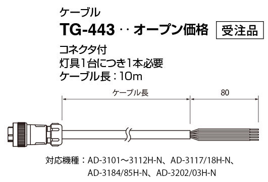 [機能/他] コメント:ポールライト用ケーブル特徴1:コネクタ付ケーブル特徴2:対応機種:AD-3101H-N~AD-3118H-N・AD-3184H-N~AD-3193H-N特徴3:灯具1台につき1本必要特徴4:ケーブル長:10m