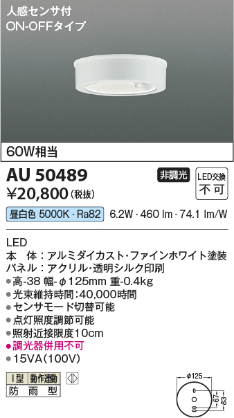 [機能/他] LED(昼白色)60W相当LED本体:アルミダイカスト・ファインホワイト塗装パネル:アクリル・透明シルク印刷●高-38 幅-φ125mm 重-0.4kg●消費電力:6.2W●定格光束:460 lm●固有エネルギー消費効率:74.1 lm/W●演色性:Ra82●色温度:5000K●光束維持時間:40,000時間●センサモード切替可能●点灯照度調節可能●照射近接限度10cm●調光器併用不可●15VA(100V)