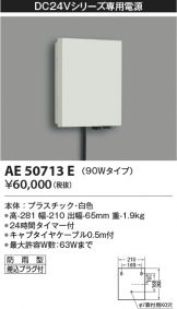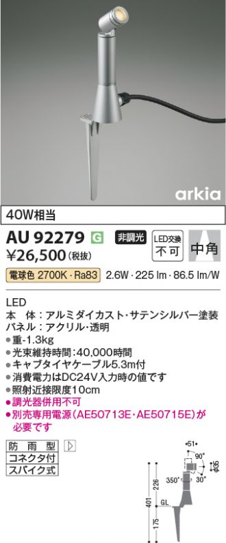 [機能/他] LED(電球色)40W相当LED本体:アルミダイカスト・サテンシルバー塗装パネル:アクリル・透明●地上高-226 埋込深-175 本体幅-φ35 本体長-51mm 重-1.3kg●消費電力:2.6W●定格光束:225 lm●固有エネルギー消費効率:86.5 lm/W●演色性:Ra83●色温度:2700K●光束維持時間:40,000時間●キャブタイヤケーブル5.3m付●消費電力はDC24V入力時の値です●照射近接限度10cm●調光器併用不可●別売専用電源(AE50713E・AE50715E)が必要です