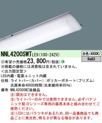 [機能/他] ◆受注品LED内蔵、電源ユニット内蔵光源◆LED(白色)◆色温度:4000 K◆光源寿命40000時間(光束維持率85%)仕様・注意事項◆安定器出力型:定格出力型◆安定器補足:<出力固定型>◆電圧:100~242 V◆【ライトバー(カバー)】ポリカーボネート(プリズム)◆Ra83◆注)調光はできません。◆注)ライトバーのみでは使用できません。必ずパナソニック製iDシリーズ専用の器具本体と組み合わせてご使用ください。◆注)LEDにはバラツキがあるため、同一品番商品でも商品ごとに発光色、明るさが異なる場合があります。