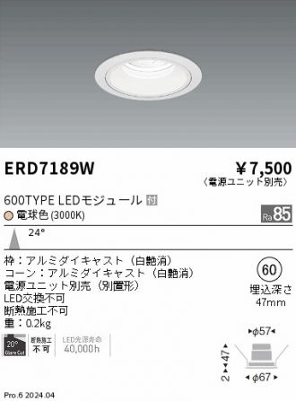 [機能/他] 〈電源ユニット別売〉600TYPE LEDモジュール付電球色24°枠:アルミダイキャスト(白艶消)コーン:アルミダイキャスト(白艶消)電源ユニット別売(別置形)LED交換不可断熱施工不可重:0.2kg47mm