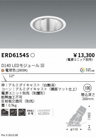 [機能/他] 〈電源ユニット別売〉D140 LEDモジュール付電球色12°枠:アルミダイキャスト(白艶消)コーン:アルミダイキャスト(鏡面マット仕上)電源ユニット別売(別置形)断熱施工不可反射板交換可(別売)重:0.5kg163mm
