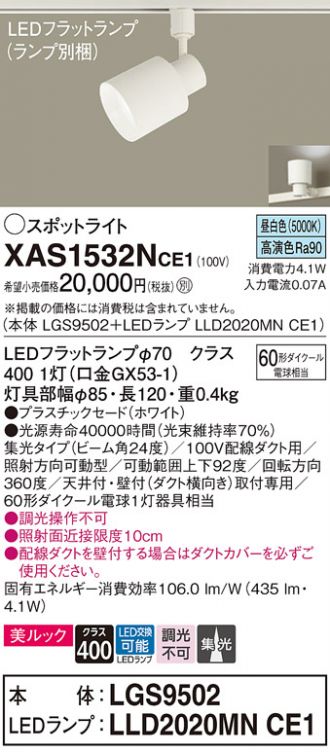 [機能/他] ランプ別梱包光源◆LEDフラットランプφ70 クラス400 1灯(口金GX53-1)◆色温度:5000 K◆光源寿命40000時間(光束維持率70%)寸法・質量◆質量:0.4 kg仕様・注意事項◆器具光束:435 lm◆電圧:100 V◆消費電力:4.1 W◆消費効率:106 lm/W◆【プラスチックセード】ホワイト◆高演色Ra90◆集光タイプ(ビーム角24度)◆100V配線ダクト用◆照射方向可動型◆可動範囲上下92度◆回転方向360度◆天井付・壁付(ダクト横向き)取付専用◆60形ダイクール電球1灯器具相当◆入力電流(100V時):0.07 A◆調光操作不可◆照射面近接限度10cm◆配線ダクトを壁付する場合はダクトカバーを必ずご使用ください。