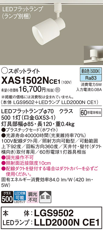 [機能/他] ランプ別梱包光源◆LEDフラットランプφ70 クラス500 1灯(口金GX53-1)◆色温度:5000 K◆光源寿命40000時間(光束維持率70%)寸法・質量◆質量:0.4 kg仕様・注意事項◆器具光束:420 lm◆電圧:100 V◆消費電力:5 W◆消費効率:84 lm/W◆【プラスチックセード】ホワイト◆Ra83◆100V配線ダクト用◆照射方向可動型◆可動範囲上下92度◆回転方向360度◆天井付・壁付(ダクト横向き)取付専用◆60形電球1灯器具相当◆入力電流(100V時):0.08 A◆調光操作不可◆照射面近接限度10cm◆配線ダクトを壁付する場合はダクトカバーを必ずご使用ください。