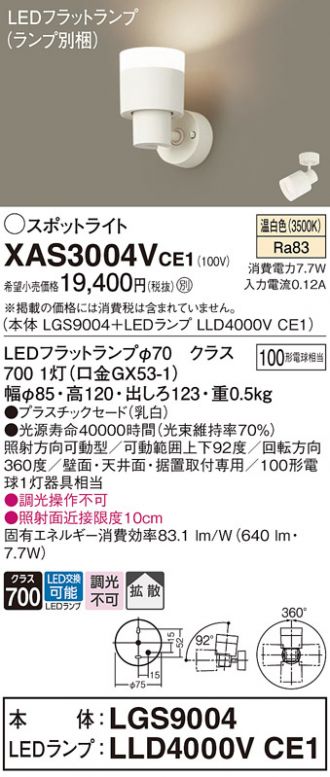 [機能/他] ランプ別梱包光源◆LEDフラットランプφ70 クラス700 1灯(口金GX53-1)◆色温度:3500 K◆光源寿命40000時間(光束維持率70%)寸法・質量◆幅:φ85 mm◆高:120 mm◆出しろ:123 mm◆質量:0.5 kg仕様・注意事項◆器具光束:640 lm◆電圧:100 V◆消費電力:7.7 W◆消費効率:83.1 lm/W◆【プラスチックセード】乳白◆Ra83◆照射方向可動型◆可動範囲上下92度◆回転方向360度◆壁面・天井面・据置取付専用◆100形電球1灯器具相当◆入力電流(100V時):0.12 A◆調光操作不可◆照射面近接限度10cm