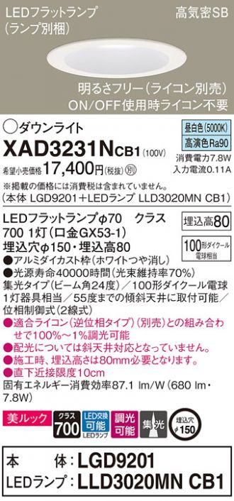 天井埋込型 LED(昼白色) ダウンライト 美ルック・浅型8H・高気密SB形・ビーム角24度・集光タイプ 調光タイプ(ライコン別売)/埋込穴φ150 110Vダイクール電球100形1灯器具相当(LGD9201+LLD3020MNCB1)