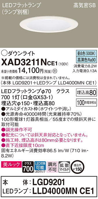 [機能/他] ランプ別梱包光源◆LEDフラットランプφ70 クラス700 1灯(口金GX53-1)◆色温度:5000 K◆光源寿命40000時間(光束維持率70%)寸法・質量◆埋込穴径:φ150 mm◆埋込高:80 mm仕様・注意事項◆器具光束:710 lm◆電圧:100 V◆消費電力:8.2 W◆消費効率:86.5 lm/W◆【アルミダイカスト枠】ホワイトつや消し◆高演色Ra90◆100形電球1灯器具相当◆55度までの傾斜天井に取付可能◆入力電流(100V時):0.13 A◆調光操作不可◆配光については斜天井対応となっていません。◆施工時、埋込高さは80mm必要となります。◆直下近接限度10cm