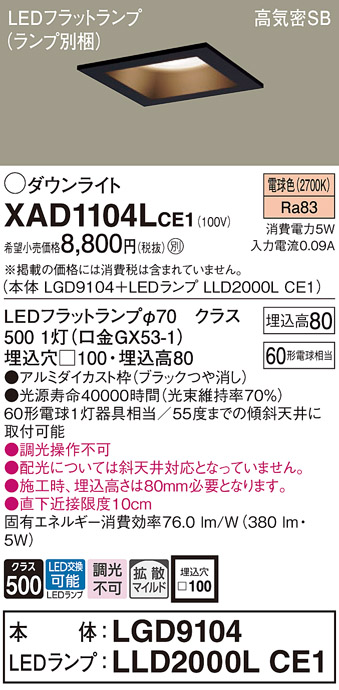 [機能/他] ランプ別梱包光源◆LEDフラットランプφ70 クラス500 1灯(口金GX53-1)◆色温度:2700 K◆光源寿命40000時間(光束維持率70%)寸法・質量◆埋込穴角:□100 mm◆埋込高:80 mm仕様・注意事項◆器具光束:380 lm◆電圧:100 V◆消費電力:5 W◆消費効率:76 lm/W◆【アルミダイカスト枠】ブラックつや消し◆Ra83◆60形電球1灯器具相当◆55度までの傾斜天井に取付可能◆入力電流(100V時):0.09 A◆調光操作不可◆配光については斜天井対応となっていません。◆施工時、埋込高さは80mm必要となります。◆直下近接限度10cm