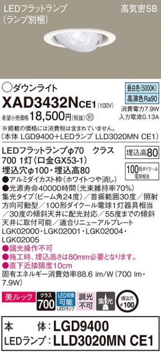 [機能/他] ランプ別梱包光源◆LEDフラットランプφ70 クラス700 1灯(口金GX53-1)◆色温度:5000 K◆光源寿命40000時間(光束維持率70%)寸法・質量◆埋込穴径:φ100 mm◆埋込高:80 mm仕様・注意事項◆器具光束:700 lm◆電圧:100 V◆消費電力:7.9 W◆消費効率:88.6 lm/W◆【アルミダイカスト枠】ホワイトつや消し◆高演色Ra90【適合リニューアルプレート】LGK02000【適合リニューアルプレート】LGK02001【適合リニューアルプレート】LGK02004【適合リニューアルプレート】LGK02005◆集光タイプ(ビーム角24度)◆首振範囲30度◆照射方向可動型◆100形ダイクール電球1灯器具相当◆30度の傾斜天井に配光対応◆55度までの傾斜天井に取付可能◆入力電流(100V時):0.13 A◆調光操作不可◆施工時、埋込高さは80mm必要となります。◆直下近接限度10cm