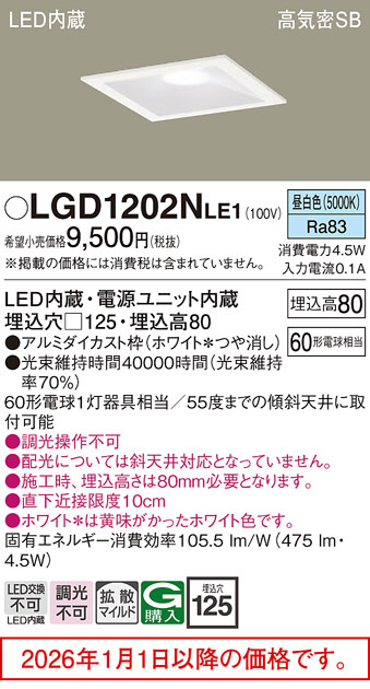 [機能/他] LED内蔵、電源ユニット内蔵光源◆LED(昼白色タイプ)1個◆色温度:5000 K◆光源寿命40000時間(光束維持率70%)寸法・質量◆埋込穴角:□125 mm◆埋込高:80 mm仕様・注意事項◆器具光束:475 lm◆電圧:100 V◆消費電力:4.5 W◆消費効率:105.5 lm/W◆【アルミダイカスト枠】ホワイトつや消し◆Ra83◆60形電球1灯器具相当◆55度までの傾斜天井に取付可能◆入力電流(100V時):0.1 A◆調光操作不可◆配光については斜天井対応となっていません。◆施工時、埋込高さは80mm必要となります。◆直下近接限度10cm