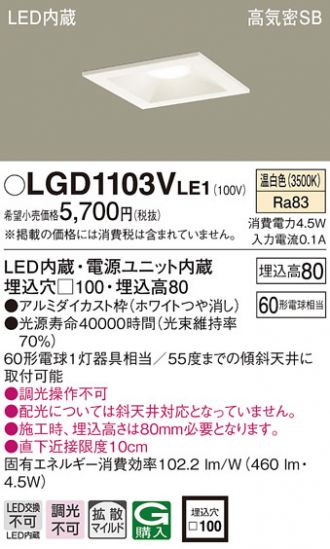 [機能/他] LED内蔵、電源ユニット内蔵光源◆LED(温白色タイプ)1個◆色温度:3500 K◆光源寿命40000時間(光束維持率70%)寸法・質量◆埋込穴角:□100 mm◆埋込高:80 mm仕様・注意事項◆器具光束:460 lm◆電圧:100 V◆消費電力:4.5 W◆消費効率:102.2 lm/W◆【アルミダイカスト枠】ホワイトつや消し◆Ra83◆60形電球1灯器具相当◆55度までの傾斜天井に取付可能◆入力電流(100V時):0.1 A◆調光操作不可◆配光については斜天井対応となっていません。◆施工時、埋込高さは80mm必要となります。◆直下近接限度10cm