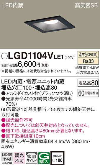 [機能/他] LED内蔵、電源ユニット内蔵光源◆LED(温白色タイプ)1個◆色温度:3500 K◆光源寿命40000時間(光束維持率70%)寸法・質量◆埋込穴角:□100 mm◆埋込高:80 mm仕様・注意事項◆器具光束:380 lm◆電圧:100 V◆消費電力:4.5 W◆消費効率:84.4 lm/W◆【アルミダイカスト枠】ブラックつや消し◆Ra83◆60形電球1灯器具相当◆55度までの傾斜天井に取付可能◆入力電流(100V時):0.1 A◆調光操作不可◆配光については斜天井対応となっていません。◆施工時、埋込高さは80mm必要となります。◆直下近接限度10cm