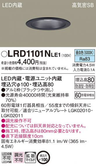[機能/他] LED内蔵、電源ユニット内蔵光源◆LED(昼白色タイプ)◆色温度:5000 K◆光源寿命40000時間(光束維持率70%)寸法・質量◆埋込穴径:φ100 mm◆埋込高:80 mm仕様・注意事項◆器具光束:365 lm◆電圧:100 V◆消費電力:4.5 W◆消費効率:81.1 lm/W◆【アルミ枠】ブラックつや消し◆Ra83【適合リニューアルプレート】LGK02010【適合リニューアルプレート】LGK02011◆60形電球1灯器具相当◆55度までの傾斜天井に取付可能◆入力電流(100V時):0.1 A◆調光操作不可◆配光については斜天井対応となっていません。◆施工時、埋込高さは80mm必要となります。◆直下近接限度10cm