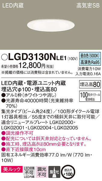 [機能/他] LED内蔵、電源ユニット内蔵光源◆LED(高演色・昼白色タイプ)◆色温度:5000 K◆光源寿命40000時間(光束維持率70%)寸法・質量◆埋込穴径:φ100 mm◆埋込高:80 mm仕様・注意事項◆器具光束:770 lm◆電圧:100 V◆消費電力:10 W◆消費効率:77 lm/W◆【アルミ枠】ホワイトつや消し◆高演色Ra95【適合リニューアルプレート】LGK02000【適合リニューアルプレート】LGK02001【適合リニューアルプレート】LGK02004【適合リニューアルプレート】LGK02005◆集光タイプ(ビーム角24度)◆100形ダイクール電球1灯器具相当◆55度までの傾斜天井に取付可能◆入力電流(100V時):0.16 A◆調光操作不可◆配光については斜天井対応となっていません。◆施工時、埋込高さは80mm必要となります。◆直下近接限度10cm