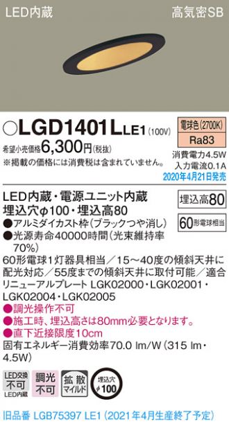 [機能/他] LED内蔵、電源ユニット内蔵光源◆LED(電球色タイプ)1個◆色温度:2700 K◆光源寿命40000時間(光束維持率70%)寸法・質量◆埋込穴径:φ100 mm◆埋込高:80 mm仕様・注意事項◆器具光束:315 lm◆電圧:100 V◆消費電力:4.5 W◆消費効率:70 lm/W◆【アルミダイカスト枠】ブラックつや消し◆Ra83【適合リニューアルプレート】LGK02000【適合リニューアルプレート】LGK02001【適合リニューアルプレート】LGK02004【適合リニューアルプレート】LGK02005◆60形電球1灯器具相当◆15~40度の傾斜天井に配光対応◆55度までの傾斜天井に取付可能◆入力電流(100V時):0.1 A◆調光操作不可◆施工時、埋込高さは80mm必要となります。◆直下近接限度10cm