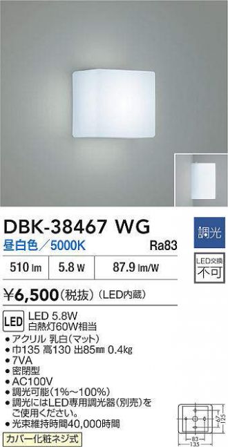 [機能/他] LED 5.8W 昼白色/5000Kアクリル 乳白(マット)巾135 高130 出85mm0.4kg●密閉型●AC100V●調光可能(1%~100%)●調光にはLED専用調光器(別売)をご使用ください。●光束維持時間40,000時間●7VA定格光束 510 lm消費電力 5.8 W固有エネルギー消費効率 87.9 lm/WRa83白熱灯60W相当