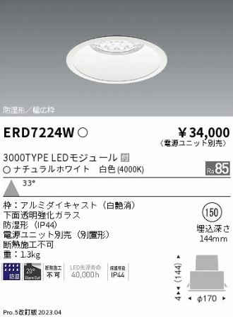 [機能/他] 〈電源ユニット別売〉3000TYPE LEDモジュール付ナチュラルホワイト 白色33°枠:アルミダイキャスト(白艶消)下面透明強化ガラス防湿形(IP44)電源ユニット別売(別置形)断熱施工不可重:1.3kg144mm