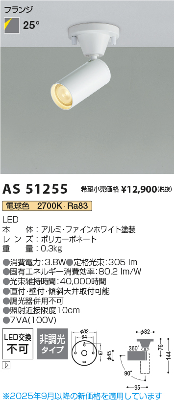 [機能/他] LEDランプLED(電球色)LED本体:アルミ・ファインホワイト塗装レンズ:ポリカーボネート重量:0.3kg●消費電力:3.8W●色温度:2700K●演色性:Ra83●定格光束:305 lm●固有エネルギー消費効率:80.2 lm/W●光束維持時間:40,000時間●調光器併用不可●直付・壁付・傾斜天井取付可能●照射近接限度10cm●傾斜天井に取り付け可能(90°まで)●7VA(100V)