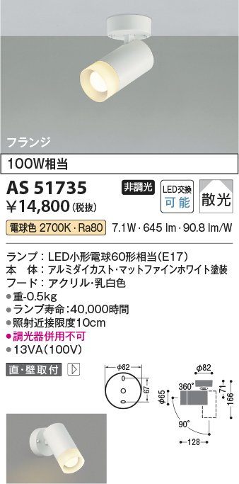 [機能/他] LED(電球色)100W相当ランプ:LED小形電球60形相当(E17)本体:アルミダイカスト・マットファインホワイト塗装フード:アクリル・乳白色●高-166 本体幅-φ65 本体長-128mm 重-0.5kg●消費電力:7.1W●定格光束:645 lm●固有エネルギー消費効率:90.8 lm/W●演色性:Ra80●色温度:2700K●ランプ寿命:40,000時間●照射近接限度10cm●調光器併用不可●13VA(100V)