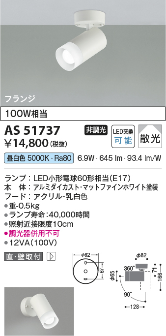 [機能/他] LED(昼白色)100W相当ランプ:LED小形電球60形相当(E17)本体:アルミダイカスト・マットファインホワイト塗装フード:アクリル・乳白色●高-166 本体幅-φ65 本体長-128mm 重-0.5kg●消費電力:6.9W●定格光束:645 lm●固有エネルギー消費効率:93.4 lm/W●演色性:Ra80●色温度:5000K●ランプ寿命:40,000時間●照射近接限度10cm●調光器併用不可●12VA(100V)