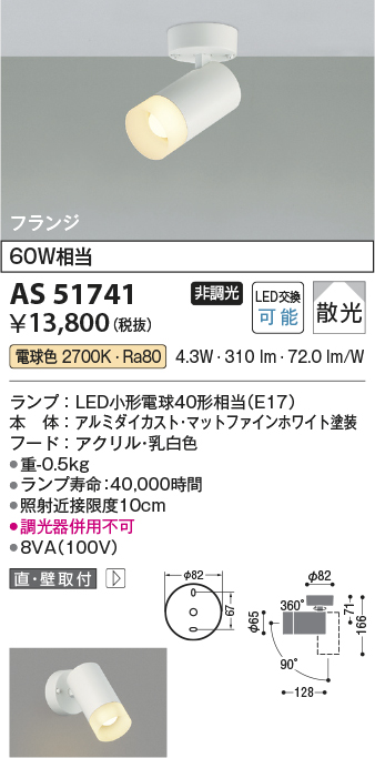 [機能/他] LED(電球色)60W相当ランプ:LED小形電球40形相当(E17)本体:アルミダイカスト・マットファインホワイト塗装フード:アクリル・乳白色●高-166 本体幅-φ65 本体長-128mm 重-0.5kg●消費電力:4.3W●定格光束:310 lm●固有エネルギー消費効率:72.0 lm/W●演色性:Ra80●色温度:2700K●ランプ寿命:40,000時間●照射近接限度10cm●調光器併用不可●8VA(100V)