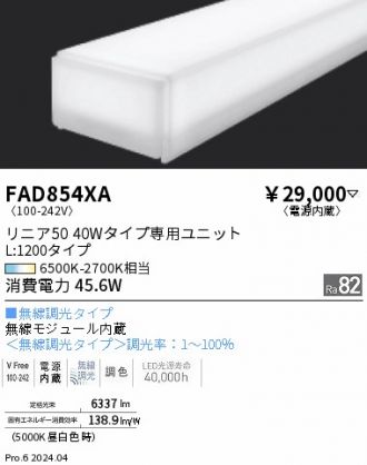 [機能/他] 〈電源内蔵〉リニア50 40Wタイプ専用ユニットL:1200タイプ6500K-2700K相当消費電力 45.6W■無線調光タイプ無線モジュール内蔵<無線調光タイプ>調光率:1-100%定格光束:6337lm (138.9lm/W)(5000K 昼白色 時)