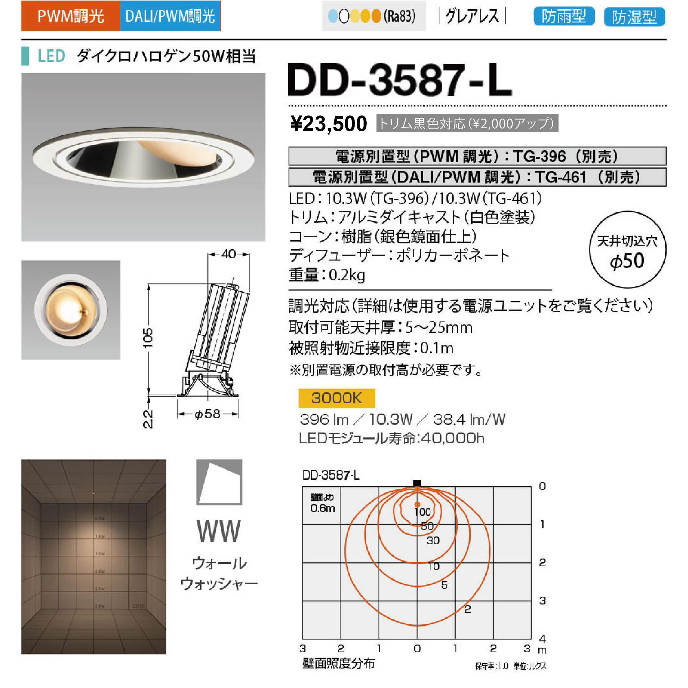特徴1:電源別売:TG-396(PWM調光・100V~242V)/TG-461(DALI/PWM調光・100V~242V)