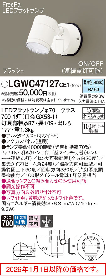 [機能/他] ランプ同梱包光源◆LEDフラットランプφ70 クラス700 1灯(口金GX53-1)◆色温度:5000 K◆光源寿命40000時間(光束維持率70%)寸法・質量◆質量:1.3 kg仕様・注意事項◆器具光束:710 lm◆電圧:100 V◆消費電力:9.3 W◆消費効率:76.3 lm/W◆【アルミダイカスト】ホワイト◆【アクリルパネル】透明◆壁直付型、ビーム角24度・集光タイプ◆Ra83◆明るさセンサ付◆壁スイッチ切替(センサ←→連続点灯)◆センサ可動範囲〔全方向20度〕◆集光タイプ(ビーム角24度)◆照射方向可動型◆可動範囲上下90度◆回転方向330度◆点灯照度調整機能付◆100形ダイクール電球1灯器具相当◆入力電流(100V時):0.14 A◆調光操作不可◆写真方向以外取り付け不可