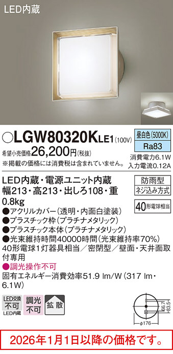 [機能/他] LED内蔵、電源ユニット内蔵光源◆LED(昼白色タイプ)◆色温度:5000 K◆光源寿命40000時間(光束維持率70%)寸法・質量◆幅:213 mm◆高:213 mm◆出しろ:108 mm◆質量:0.8 kg仕様・注意事項◆器具光束:317 lm◆電圧:100 V◆消費電力:6.1 W◆消費効率:51.9 lm/W◆デザイン分類:Stylish Moder◆【アクリルカバー】透明・内面白塗装◆【プラスチック枠】プラチナメタリック◆【プラスチック本体】プラチナメタリック◆天井直付型・壁直付型、拡散タイプ・密閉型◆Ra83◆40形電球1灯器具相当◆密閉型◆壁面・天井面取付専用◆入力電流(100V時):0.12 A◆調光操作不可