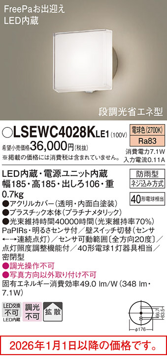 [機能/他] LED内蔵、電源ユニット内蔵光源◆LED(電球色タイプ)◆色温度:2700 K◆光源寿命40000時間(光束維持率70%)寸法・質量◆幅:185 mm◆高:185 mm◆出しろ:106 mm◆質量:0.7 kg仕様・注意事項◆器具光束:348 lm◆電圧:100 V◆消費電力:7.1 W◆消費効率:49 lm/W◆デザイン分類:Stylish Moder◆【アクリルカバー】透明・内面白塗装◆【プラスチック本体】プラチナメタリック◆壁直付型、拡散タイプ・密閉型◆Ra83◆明るさセンサ付◆壁スイッチ切替(センサ←→連続点灯)◆センサ可動範囲〔全方向20度〕◆点灯照度調整機能付◆40形電球1灯器具相当◆密閉型◆入力電流(100V時):0.11 A◆調光操作不可◆写真方向以外取り付け不可