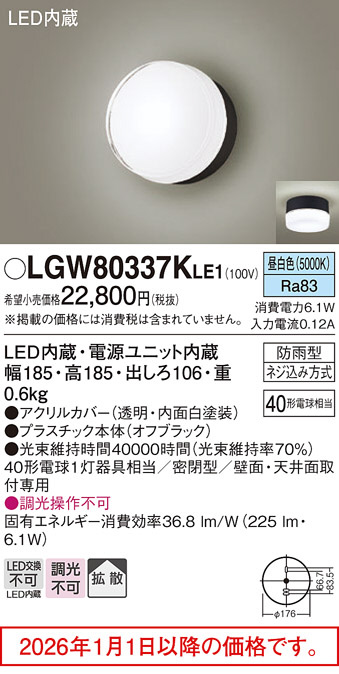 [機能/他] LED内蔵、電源ユニット内蔵光源◆LED(昼白色タイプ)◆色温度:5000 K◆光源寿命40000時間(光束維持率70%)寸法・質量◆幅:185 mm◆高:185 mm◆出しろ:106 mm◆質量:0.6 kg仕様・注意事項◆器具光束:225 lm◆電圧:100 V◆消費電力:6.1 W◆消費効率:36.8 lm/W◆デザイン分類:Stylish Moder◆【アクリルカバー】透明・内面白塗装◆【プラスチック本体】オフブラック◆天井直付型・壁直付型、拡散タイプ・密閉型◆Ra83◆40形電球1灯器具相当◆密閉型◆壁面・天井面取付専用◆入力電流(100V時):0.12 A◆調光操作不可