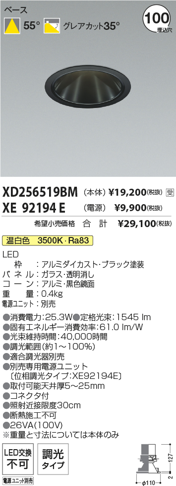 [機能/他] LEDランプLED(温白色)LED枠:アルミダイカスト・ブラック塗装パネル:ガラス・透明消しコーン:アルミ・黒色鏡面重量:0.4kg電源ユニット:別売●消費電力:25.3W●色温度:3500K●演色性:Ra83●定格光束:1545 lm●固有エネルギー消費効率:61.0 lm/W●光束維持時間:40,000時間●調光範囲(約1~100%)●適合調光器別売●別売専用電源ユニット(位相調光タイプ:XE92194E)●取付可能天井厚5~25mm●照射近接限度30cm●コネクタ付●断熱施工不可●26VA(100V)※重量と寸法については本体のみ