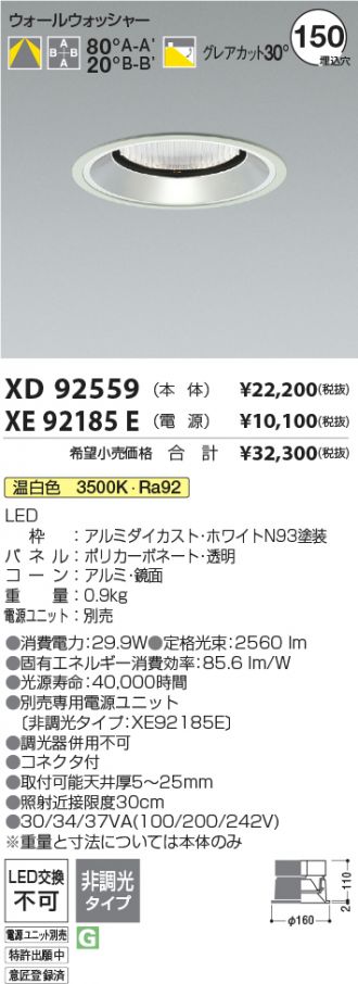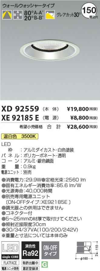 [機能/他] LED枠:アルミダイカスト・ホワイトN93塗装パネル:ポリカーボネート・透明コーン:アルミ・鏡面LED(温白色)重量:0.9kg電源ユニット:別売●消費電力:29.9WLEDランプ●色温度:3500K●演色性:Ra92●定格光束:2560 lm●固有エネルギー消費効率:85.6 lm/W●光源寿命:40,000時間●別売専用電源ユニット〔非調光タイプ:XE92185E〕●調光器併用不可●コネクタ付●取付可能天井厚5~25mm●照射近接限度30cm●100-242V対応●30/34/37VA(100/200/242V)※重量と寸法については本体のみ