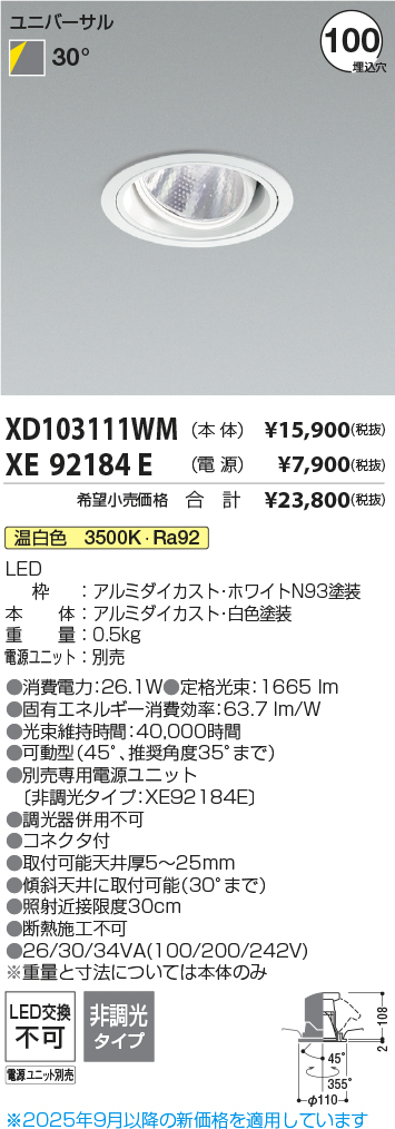 [機能/他] LED(温白色)HID35W相当LED枠:アルミダイカスト・ホワイトN93塗装本体:アルミダイカスト・ホワイトN93塗装重量:0.5kg電源ユニット:別売●色温度:3500K●演色性:Ra92●光束維持時間:40,000時間●可動型(45°、推奨角度35°まで)●専用電源ユニット別売●適合調光器別売●コネクタ付●取付可能天井厚5~25mm●傾斜天井に取付可能(30°まで)●照射近接限度30cm●断熱施工不可