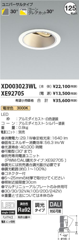 [機能/他] LED枠:アルミダイカスト・ホワイトN93塗装コーン:アルミダイカスト・シルバー塗装重量:0.8kgLED(電球色)電源ユニット:別売●消費電力:29.1W●色温度:3000KLEDランプ●演色性:Ra92●定格光束:1640 lm●固有エネルギー消費効率:56.3 lm/W●光源寿命:40,000時間●調光範囲(約0.1~100%)●可動型(30°まで)●別売専用電源ユニット〔DALI/PWM調光タイプ:XE92705〕●取付可能天井厚5~25mm●適合調光器別売●マルチリニューアルプレートのみ併用可●コネクタ付●照射近接限度30cm●30/30/32VA(100/200/242V)※重量と寸法については本体のみ