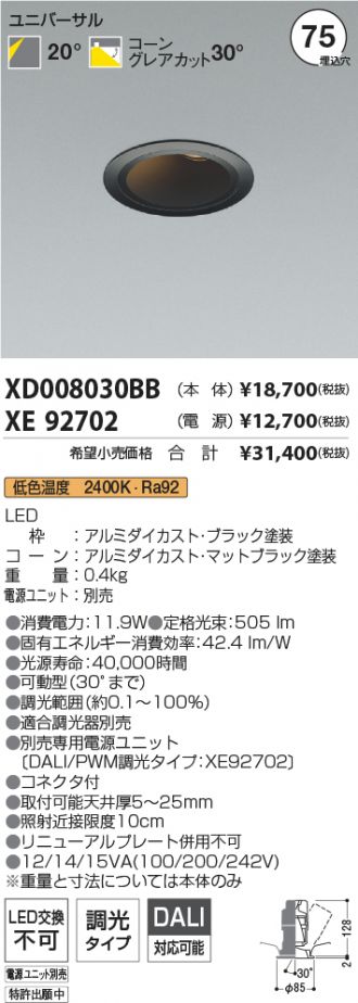 [機能/他] LED枠:アルミダイカスト・ブラック塗装コーン:アルミダイカスト・マットブラック塗装重量:0.4kgLED(低色温度)電源ユニット:別売●消費電力:11.9W●色温度:2400KLEDランプ●演色性:Ra92●定格光束:505 lm●固有エネルギー消費効率:42.4 lm/W●光源寿命:40,000時間●調光範囲(約0.1~100%)●可動型(30°まで)●別売専用電源ユニット〔DALI/PWM調光タイプ:XE92702〕●取付可能天井厚5~25mm●適合調光器別売●リニューアルプレート併用不可●コネクタ付●照射近接限度10cm●12/14/15VA(100/200/242V)※重量と寸法については本体のみ