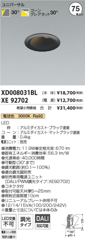 [機能/他] LED枠:アルミダイカスト・ブラック塗装コーン:アルミダイカスト・マットブラック塗装重量:0.4kgLED(電球色)電源ユニット:別売●消費電力:11.9W●色温度:3000KLEDランプ●演色性:Ra92●定格光束:670 lm●固有エネルギー消費効率:56.3 lm/W●光源寿命:40,000時間●調光範囲(約0.1~100%)●可動型(30°まで)●別売専用電源ユニット〔DALI/PWM調光タイプ:XE92702〕●取付可能天井厚5~25mm●適合調光器別売●リニューアルプレート併用不可●コネクタ付●照射近接限度10cm●12/14/15VA(100/200/242V)※重量と寸法については本体のみ