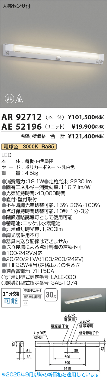 [機能/他] LEDランプLED(電球色)LEDセード:ポリカーボネート・乳白色●消費電力:19.1W●色温度:3000K●演色性:Ra85●光束維持時間:40,000時間●調光器併用不可●非常点灯時光束:1,200lm●100-242V対応●20/20/21VA(100/200/242V)