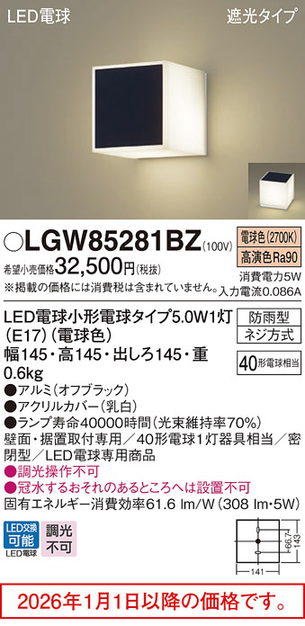 [機能/他] 発光ダイオード(LED)5W幅145・高145・出しろ145アルミ(オフブラック)・アクリルカバー(乳白)