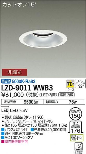 [機能/他] 受注生産品カットオフ15°LED 75W 昼白色/5000K径φ165 埋込穴φ150 埋込深176mm1.8kg●ガラスパネル付●光束維持時間40,000時間●取付可能天井厚5~25mm●AC100V~242V●調光器併用不可定格光束 9500 lm定格消費電力 75 W固有エネルギー消費効率 126.6 lm/WRa831/2ビーム角 92°
