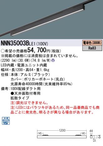 [機能/他] LED内蔵、電源ユニット内蔵光源◆LED(電球色)◆色温度:3000 K◆光源寿命40000時間(光束維持率85%)寸法・質量◆幅:44 mm◆長:1200 mm◆高:64 mm◆質量:1.6 kg仕様・注意事項◆器具光束:2290 lm◆電圧:100 V◆消費電力:30.6 W◆消費効率:74.8 lm/W◆【本体】アルミ(ブラック)◆【カバー】ポリカーボネート(乳白)◆配線ダクト取付型、L1200タイプ、下面パネルタイプ・拡散タイプ・光源遮光角15度◆Ra83◆100V配線ダクト用◆●天井面取付専用◆拡散タイプ◆入力電流(100V時):0.31 A◆注)調光はできません。◆注)LEDにはバラツキがあるため、同一品番商品でも商品ごとに発光色、明るさが異なる場合があります。