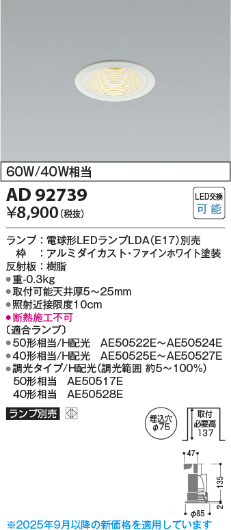 〔適合ランプ〕●50形相当/H配光 AE50522E~AE50524E●40形相当/H配光 AE50525E~AE50527E●調光タイプ/H配光(調光範囲 約5~100%)50形相当 AE50517E 40形相当 AE50528E