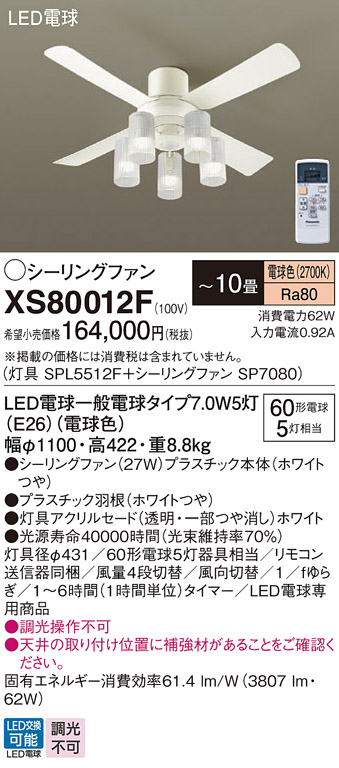 [機能/他] ランプ同梱包光源◆LED電球一般電球タイプ7.0W5灯(E26)(電球色)◆色温度:2700 K◆光源寿命40000時間(光束維持率70%)寸法・質量◆幅:φ1100 mm◆高:422 mm◆質量:8.8 kg仕様・注意事項◆器具光束:3807 lm◆電圧:100 V◆消費電力:62 W◆消費効率:61.4 lm/W◆畳数:~10畳◆天井直付型、27W◆Ra80◆灯具径φ431◆60形電球5灯器具相当◆リモコン送信器同梱◆風量4段切替◆風向切替◆1/fゆらぎ◆1~6時間(1時間単位)タイマー◆LED電球専用商品◆入力電流(100V時):0.92 A◆調光操作不可◆天井の取り付け位置に補強材があることをご確認ください。